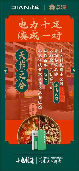 近日,“IoT+便民充电服务创领者”小电科技与全国知名台式火锅连锁品牌“湊湊”达成合作,独家入驻湊湊火锅全国范围近100家门店。这是小电科技继成功与海底捞联手之后,深度挖掘国内餐饮优质赛道的又一重要布局,未来双方将在续电服务、品牌营销等多个层面展开深入合作。